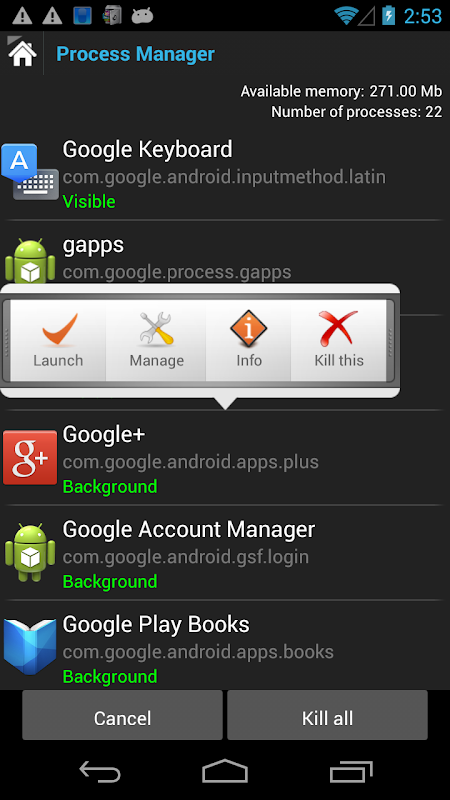 * Process Manager - Kill and view running processes . Kill All button to free up Memory .*Backup Manager - Backup ,Uninstall and Share your Installed applications with this easy to use Backup manager .*General functions like - Cut , Copy ,Move ,Delete and Rename your Files and Folders .