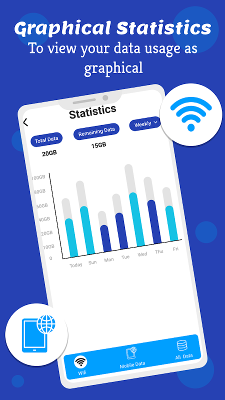 You can set whatever you want like daily, weekly, monthly, quarterly and yearly data usage statistics. It will show in table as well as in graphs and will indicate about the usage. You can settle with the setting (Wi-Fi, 3G, 4G, 5G) and show how much you can use.