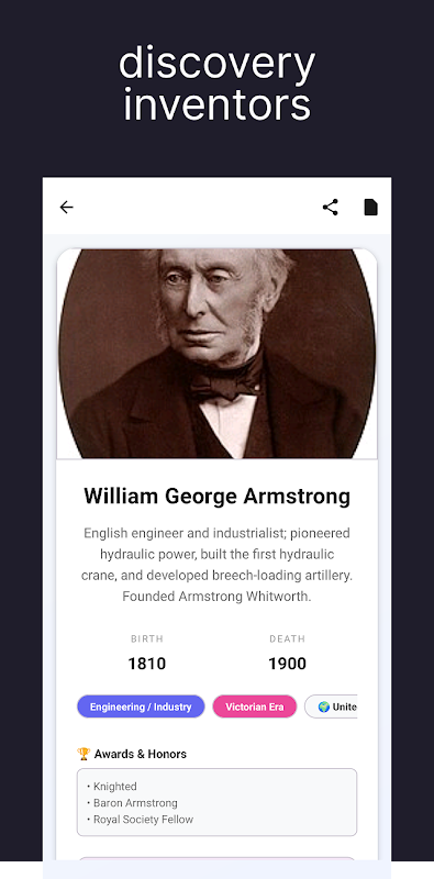 Inventors는 각 프로필을 살아있는 이야기처럼 다루는 이중 언어 백과사전 앱으로, 검증된 데이터와 고해상도 사진으로 가득한 현대적인 디자인의 백과사전을 통해 각 프로필을 제시합니다.