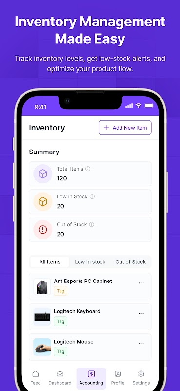 🌟Inventory Management: Record, track, and manage all your incoming & outgoing inventory items with ease. Automatically update the stock count whenever you create an invoice, bill, expense.