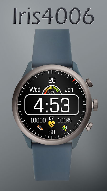 Iris4006 is a digital watch that is and simple and functional with plenty of colorful options. The watch face displays day, date, and month. The time is displayed in either 12 hour or 24 hour format and is automatically set by your smartphone time format setting. Battery percentage, heart rate, step count and step goal percentage are displayed. There are 6 color theme options. Most languages are supported. See feature guide for details.
