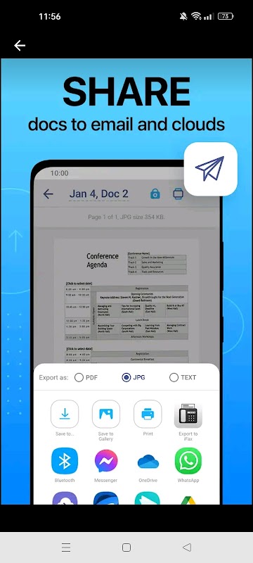 • PDF scanner—scan to PDF or JPEG and put any number of pages together in one convenient document