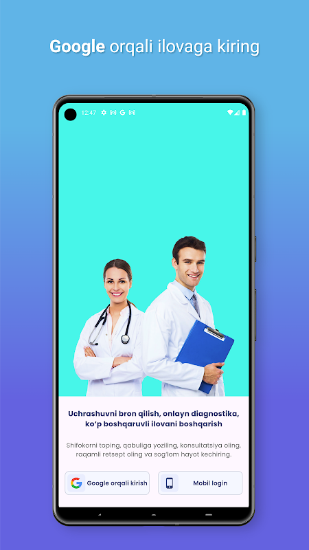 Ushbu ilova orqali shifokorni tanlash va o'zingizga qulay vaqtda tibbiy maslahat olishga imkon beradi. Shifokor maslahatini tanlaganingizdan so'ng belgilangan vaqtda shifokorni o'zi siz bilan video aloqaga chiqadi. Shifokor yoki sun'iy intellekt bilan chat orqali ham suhbatlashing. Tekshiruv xulosalarini ham shifokorga tibbiy maslahatdan avval chat orqali yuboring.