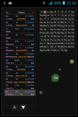 The application contains a list of all the main isotopes of chemical elements, their half-lives. Selecting any of them from the list, the program will show the products of its decay. The program allows you to see more qualitative questions about isotopes in order to understand their diversity in terms of number and decay products. The program is useful for those who are interested in atomic physics.
