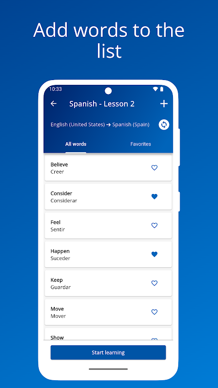 나만의 목록 만들기: 학업에 꼭 맞는 나만의 어휘 목록을 작성하세요. 나중에 추가로 연습할 수 있도록 단어를 추가하고 어려운 단어를 즐겨찾기로 표시하세요.