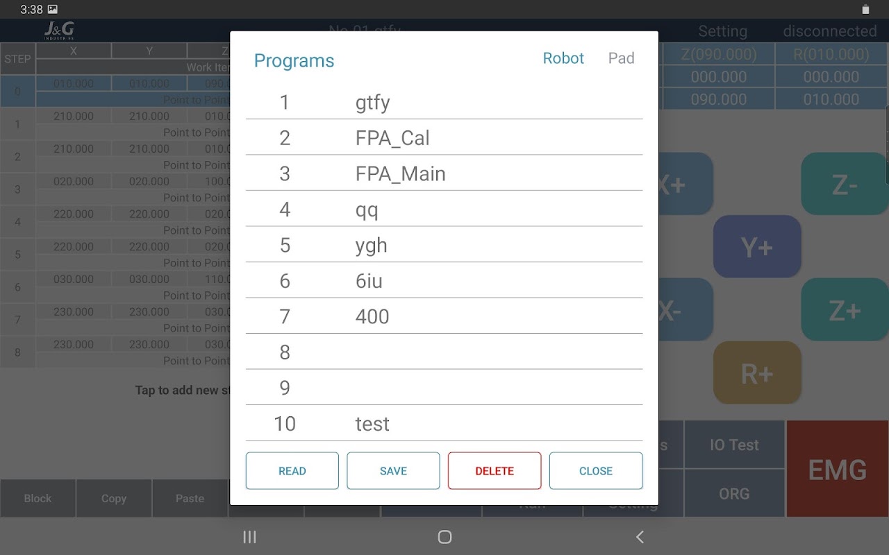 J&G Robot의 티칭, 시험, 도작, 정지 및 Robot 운용하기 위한 기능과 Robot Program 관리, 유지보수 하는 App입니다