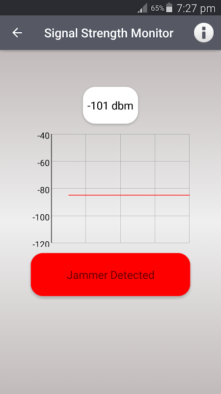 Jammer Detector and Signal Strength Monitor is an app that detects any jamming device arround you. A jammer device is capable of inhibiting GSM signals which can be used to disable the use of mobile phones in certain areas such as hospitals, libraries, restricted areas etc. It also let you know the current network signal strength in dBm (unit).
