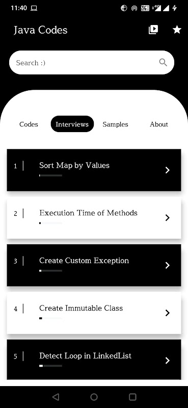 - Three Modules : Codes, Interviews and Samples for better learning.