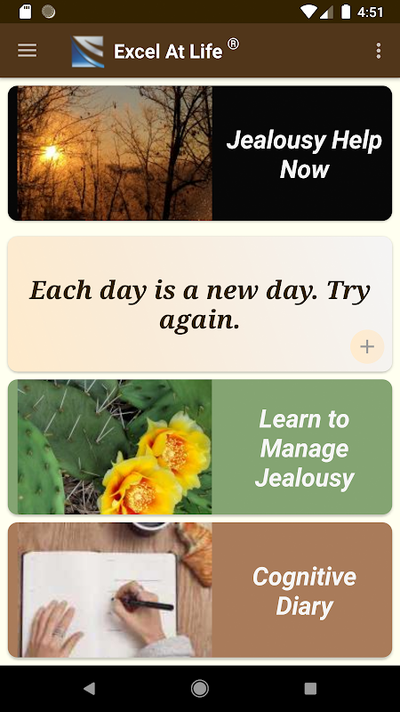 Excel At Life의 Jealousy CBT 도구는인지 행동 치료 (CBT) 방법을 간단한 형식으로 사용하여 비합리적인 질투를 관리하는 방법을 학습합니다. 이 앱에서 제공하는 도구는 CBT 연구 기반에서 파생되었으며 30 년 이상의 임상 경험을 가진 심리학자에 의해 사용자 친화적 인 형식으로 개발되었습니다.