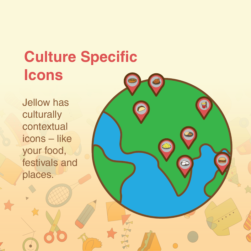 4. 문화별 아이콘: Jellow에는 음식, 축제 및 장소와 같은 문화적으로 상황에 맞는 아이콘이 있습니다.