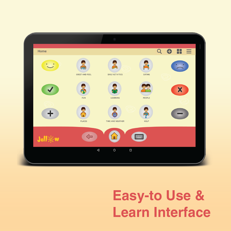 Jellow Basic은 시각적으로 매력적인 이미지를 가지고 있으며 매우 간단하고 사용하기 쉽고 배우기 쉽고 음식, 축제 및 여러 언어에 액세스할 수 있는 장소에 문화적으로 민감합니다. Jellow의 인터페이스는 중앙의 '카테고리' 버튼과 '표현적인' 측면 버튼으로 구성되어 있습니다. 사용자는 카테고리 버튼과 표현 버튼을 차례로 클릭하여 앱이 문장을 말하도록 할 수 있습니다. 앱의 콘텐츠는 사용자가 원하는 아이콘에 쉽게 액세스하고 찾을 수 있도록 기본 카테고리 버튼으로 구성되어 있습니다.
