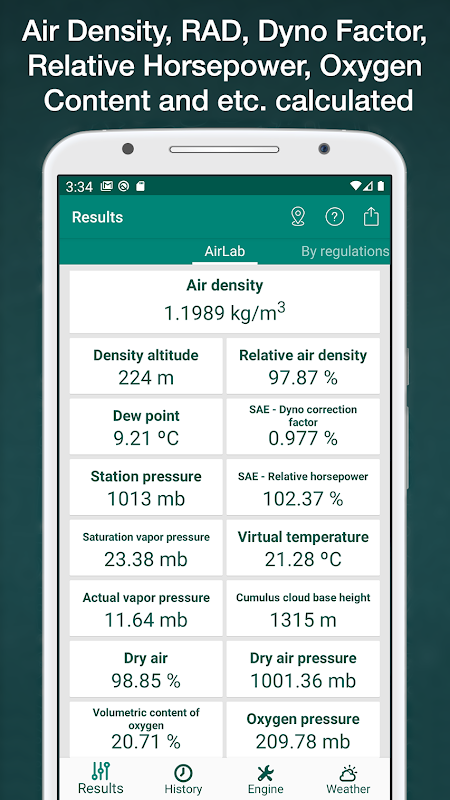 또한 공기 밀도, 밀도 고도, 상대 공기 밀도, SAE-다이노 보정 계수, 스테이션 압력, SAE-상대 마력, 산소의 체적 함량, 산소 압력도 표시됩니다.