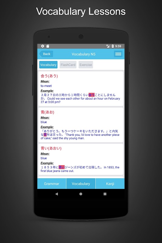 어휘 섹션에서 당신은 당신이 연습하고 더 오래 기억하는 데 도움이됩니다 플래시 카드와 어휘 퀴즈를 통해 일본어 어휘 (일본어 단어)를 배울 수 있습니다.