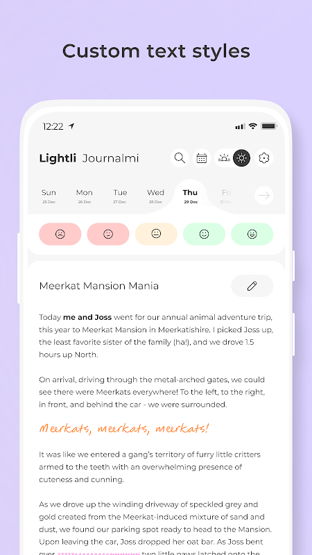 다양한 텍스트 스타일로 자유롭게 감정을 표현하고, 사진을 첨부하고, 감정을 추적하고, 태그로 생각을 정리해 보세요. 고급 모듈을 사용하면 레이더 맵으로 진행 상황을 시각화하고, 슬라이더 막대로 지표를 추적하고, 마일스톤으로 성과를 축하할 수 있습니다.