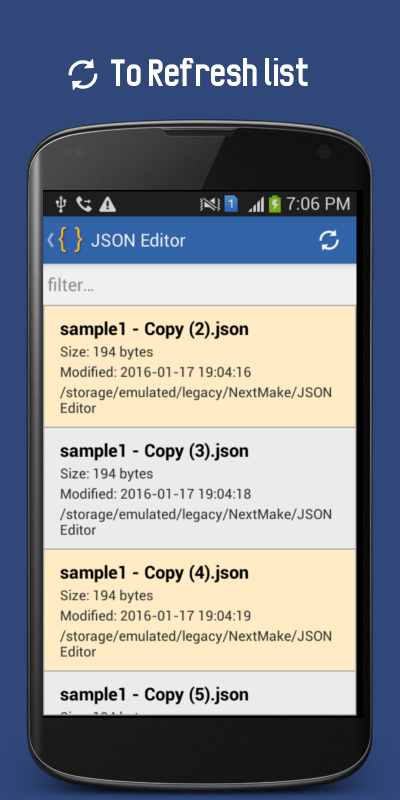 응용 프로그램 목록 전화에 존재하는 모든 JSON 파일. 우리는, 편집, 다운로드, 검증 및 공유 (텍스트) JSON 파일을 작성하려면이 응용 프로그램을 사용할 수 있습니다.