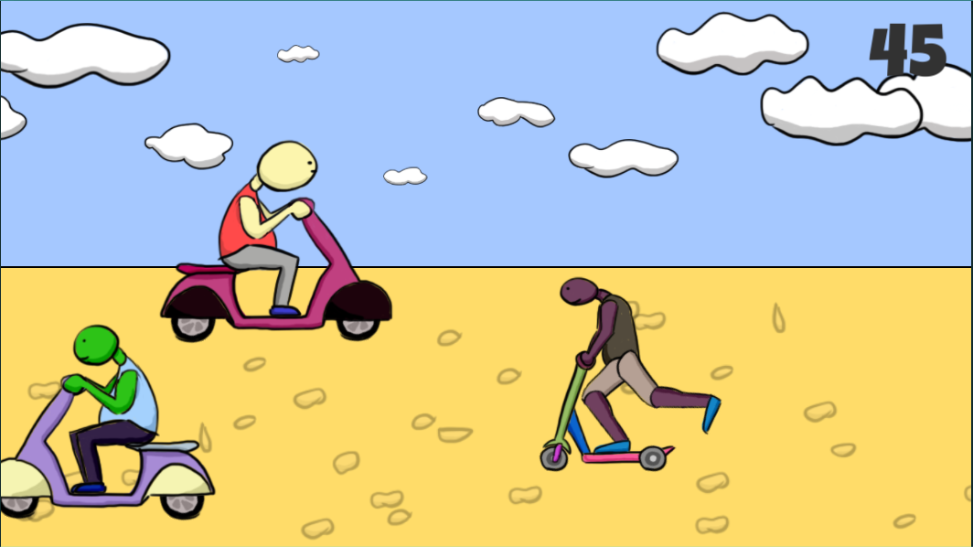 You're on your way home from a nice day of work, but it's rush hour, and it's only getting worse and worse. How long can you survive on your scooter in this highly entertaining scooter adventure? Touch right/left part of the screen to drive upwards/downwards.