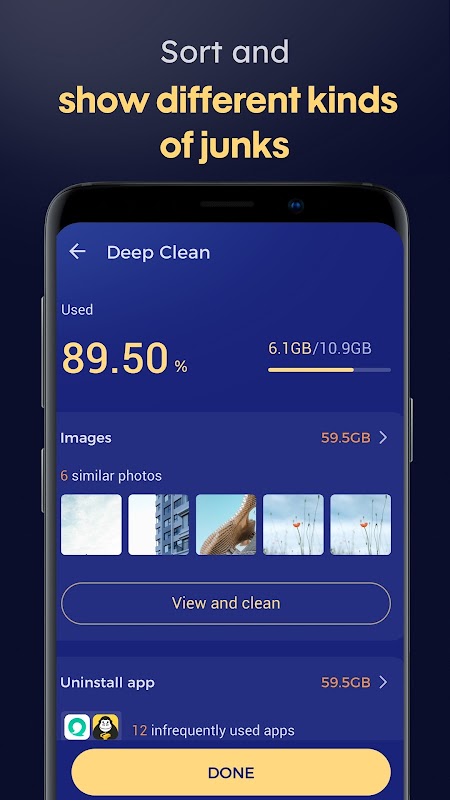 표면 청소 그 이상을 경험해 보세요. JunkClean은 저장소에 대한 심층 검사를 수행하여 대용량 파일, 중복, 빈 폴더 등을 식별합니다. 휴대폰의 저장 공간을 손쉽게 관리하세요.