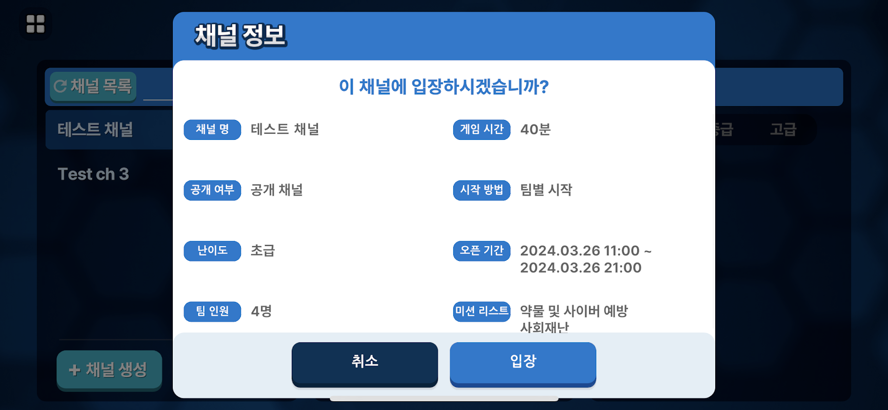 - 채널 생성 시 게임 시간, 수행 미션 수 등을 설정