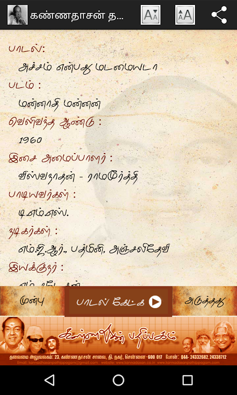 이 응용 프로그램은 Kannadhasan Pathippagam의 이니셔티브이며, 200 개의 Kannadasan Thathuva Padal varigal로 구성되어 있습니다.