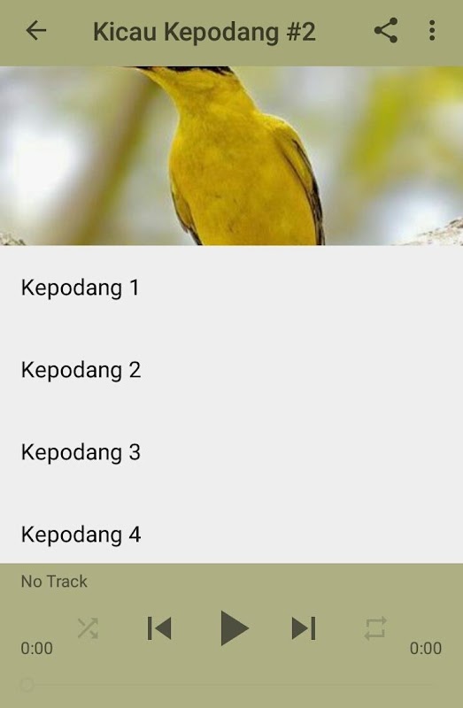 Aplikasi ini berisi kicauan burung kepodang yang merdu dan pengetahuan tentang kepodang. Kicauan ini juga dapat digunakan untuk melatih burung, isian maupun untuk hiburan. Happy fun...