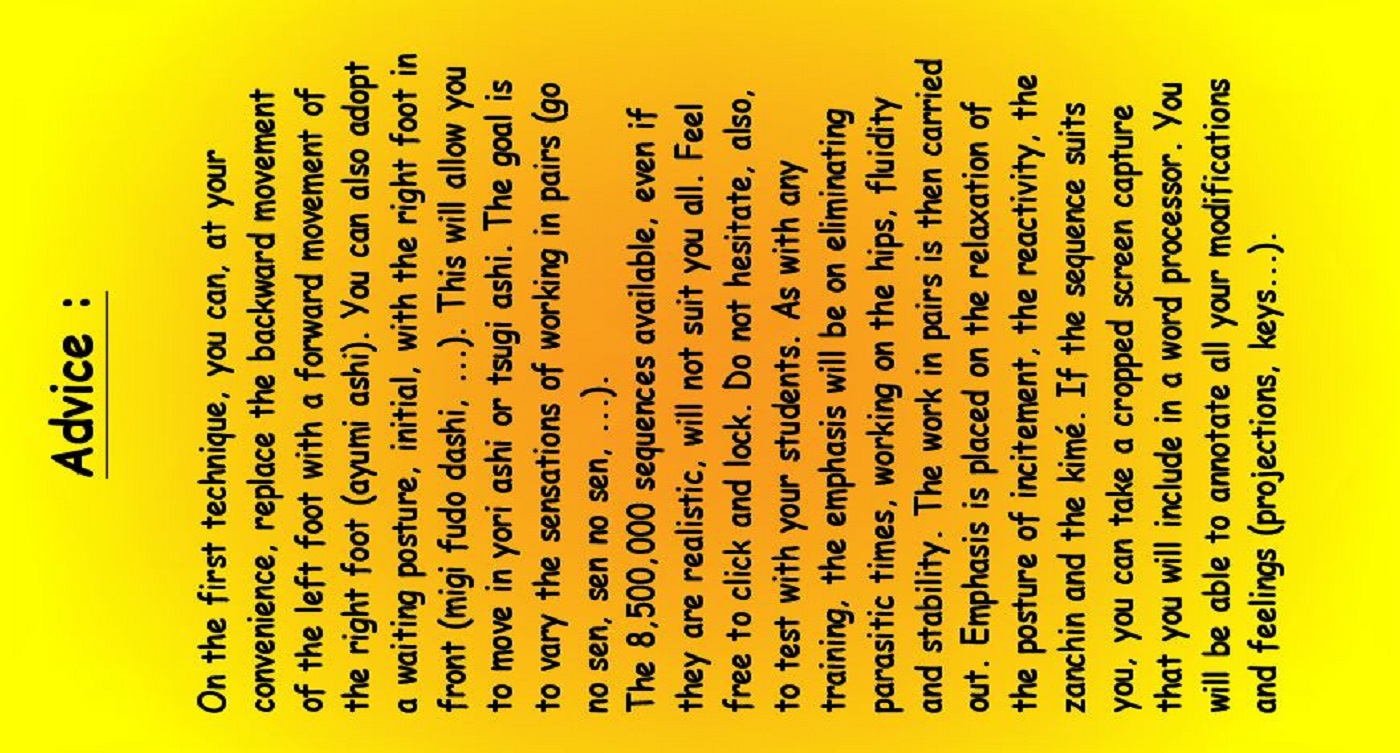 첫 번째 기술에서는 편의에 따라 왼발의 뒤로 이동을 오른발의 앞으로 이동(아유미 아시)으로 바꿀 수 있습니다. 오른쪽 발을 앞에 두고 대기자세, 이니셜을 채택할 수도 있습니다(migi fudo dashi, ...). 이것은 당신이 yori ashi 또는 tsugi ashi에서 이동할 수 있게 합니다. 목표는 쌍으로 작업하는 감각을 다양화하는 것입니다(go no sen, sen no sen, ...).