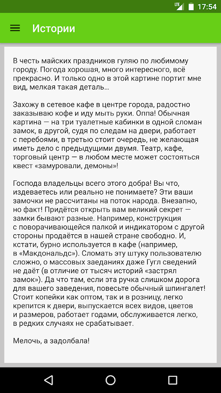 Приложение Kill The Time позволяет загружать и читать развлекательный контент из сети Интернет. Используются пять популярных источников: Цитатник, Истории, Анекдоты, Афоризмы, Говорят Дети. Простое и красивое приложение без рекламы и с материальным дизайном поддерживает копирование целого сообщения по одному клику, чтобы вы могли делиться понравившимися вам цитатами с друзьями через различные мессенджеры и социальные сети. Обновление доступно по движению свайп (движением пальца сверху вниз по экрану телефона), а чтение возможно и в местах, где нет сети или плохой интернет. Поэтому наше приложение скрасит ваше время и поднимет вам настроение в метро или другом общественном транспорте, в очередях или просто, когда у вас будет свободная минутка.