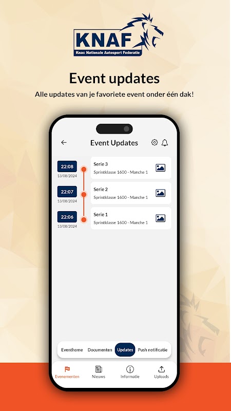 SONAK(네덜란드 Autocross Championship Organization Foundation)에서는 이 앱을 적극적으로 사용하고 있습니다. 이 앱은 대중과 참가자에게 최신 업데이트를 지속적으로 알려줍니다. 이렇게 하면 수업별로 참여 팀에게 푸시 메시지를 보낼 수 있습니다. 앱은 조직과 참가자 간의 공식적인 의사소통 수단입니다.