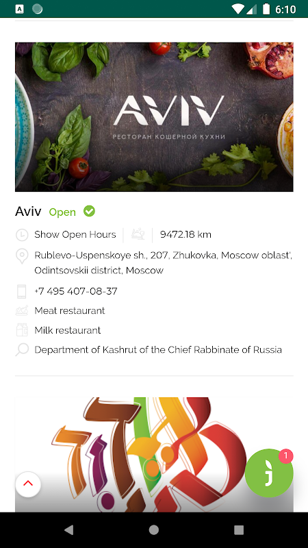 뉴욕, 앤트워프 또는 방콕 어딘가에있는 지금 먹고 싶습니까? 검색 창에 위치를 입력하고 최소 반경을 선택하십시오! 프라하 또는 오데사 (Odessa)의 어딘가에서 자신이나 가족을위한 정결 한 숙박을 찾고 계십니까? 그런 다음 최소한의 클릭으로 검색을 확장 할 수 있습니다! 어떤 경우에도 Google의 추가 정보는 필요 없습니다. 각 기관은 Kashrut 인증서, 사진, 영업 시간, 위치, 실내 및 음식 설명, 소셜 네트워크 등 세부 사항에 대해 세부적으로 연구되었습니다.