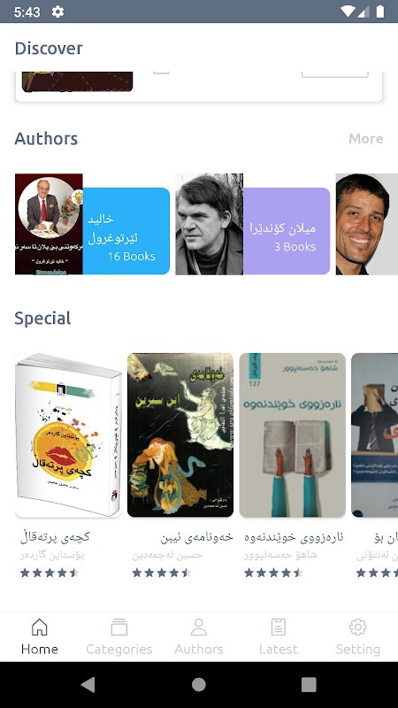 이 앱에는 매일 더 많은 책이 서버에 추가되는 수백 권의 쿠르드어 책이 포함되어 있습니다. 책은 이야기, 소설, 철학,시, 역사, 과학, 종교, 언어, 사회 및 아동 도서를 포함한 여러 범주로 분류됩니다.