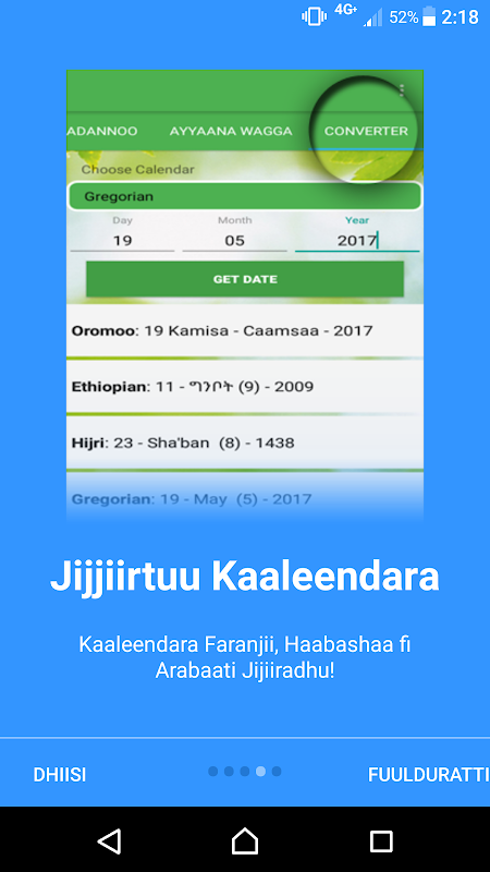 이 응용 프로그램은 공식적 Oromia 국가, 지역, 국가 (caffee의 oromiyaa ጨፌ ኦሮሚያ)에 의해 구현되는 오로모어 일정이 포함되어 있습니다. 이것은 원래의 토착 오로모어 달력 (Dhaha Oromoo) 아닙니다. 이 Afaan Oromoo에서 그레고리력이다.