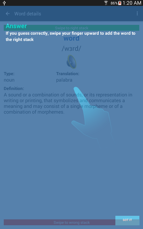 This application let you add words that you don't know of a language (for now only English is supported), and automatically download for you from Internet the definition, translation, type and even usage examples (if they are available) so that, later you can test your knowledge of them, and listen their pronunciation!