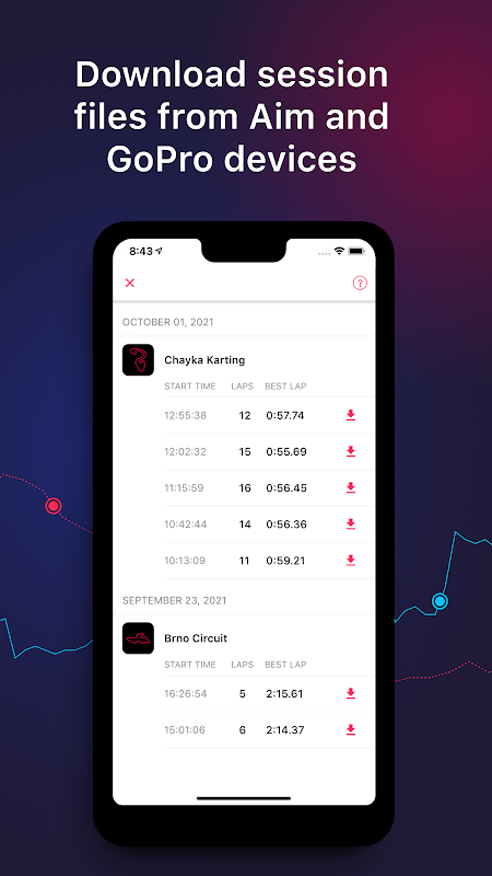 Aim Solo 2, MyChron, GPS 지원 GoPro 또는 RaceBox를 휴대폰에 연결하고 세션을 다운로드하여 경주 트랙에서 최대한 활용하세요. LapSnap은 추가 장비 없이 AiM 장치를 휴대폰에 직접 연결할 수 있는 최초의 모바일 앱입니다. 연결하고 다운로드하고 분석하기만 하면 됩니다.
