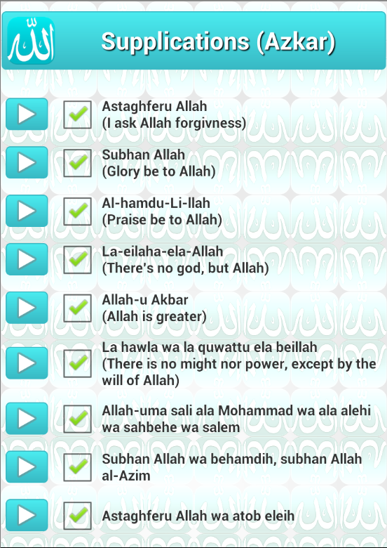 몇 분 또는 몇 시간마다 불편 함이나 당황을 유발하지 않는 조용한 짧은 알림 (텍스트, 오디오 또는 둘 다)을 재생하여 용서 "Estighfar"및 기타 사용 가능한 duaa를 나타냅니다.