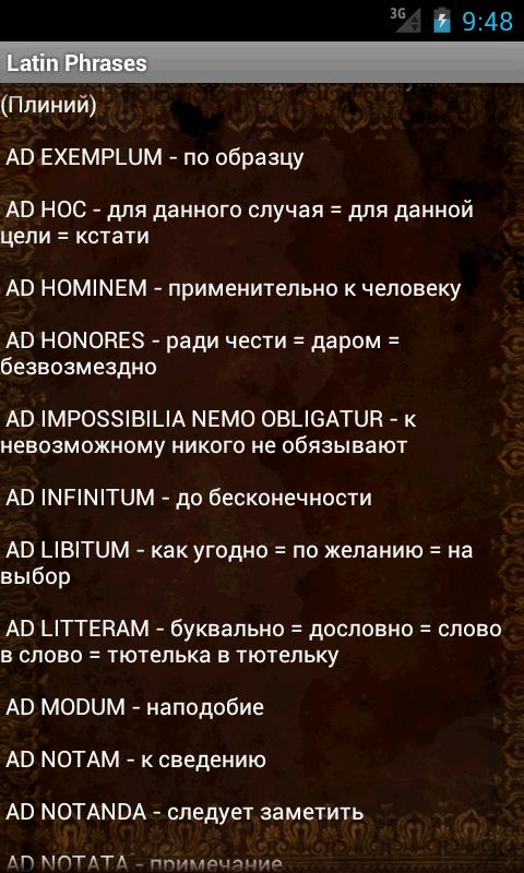Интересуетесь латинским языком? Любите крылатые фразы и выражения? Это приложение поможет вам узнать больше крылатых фраз, высказанных в разное время на латыни великими людьми - можно читать как всю базу цитат, так и каждый день читать по случайной фразе и брать ее на вооружение на текущий день. В этой бесплатной версии настройки позволяют активировать получение случайной фразы в статус баре в установленное пользователем время, с повторением раз в сутки.