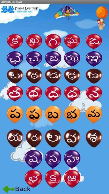 Learn Alphabets - Telugu is a very innovative and interactive way to give the first exposure of Telugu alphabets and numbers to your child. Children can experience the shape of alphabets and numbers using different colors & brushes. Children can play and have fun with popping the balloons and song.