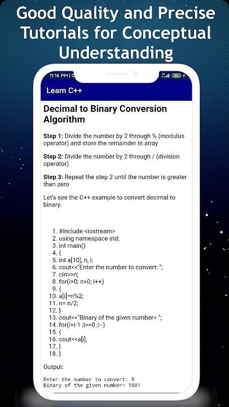 Learn C++ contains all important topics which are vital for better understanding of learner. This will definitely help you for getting better at C++ programming language. This app will help you learn all you need to know in order to start creating and compiling your own programs. These topics are well organized step-by-step for beginners and each level of learner.