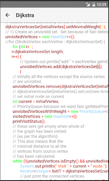 Presently the app contains implementations of popular algorithms and data structures in Java. We plan to add on more content in future. A list of code samples in the app: