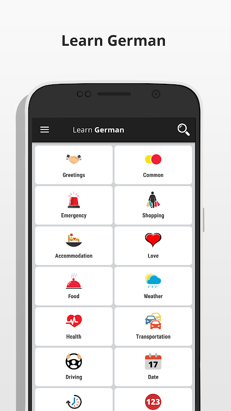 Learn German Language to Speak German app will allow you to learn the German phrases and expressions for FREE. The app is very straightforward, which makes it effective for beginners. All the lessons are appropriately categorized for the hassle-free learning experience. You can easily find the category you need to use or want to learn.