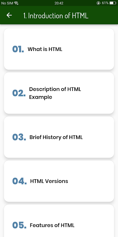 이 앱에서 다루는 HTML 자습서 및 주제는 다음과 같습니다.