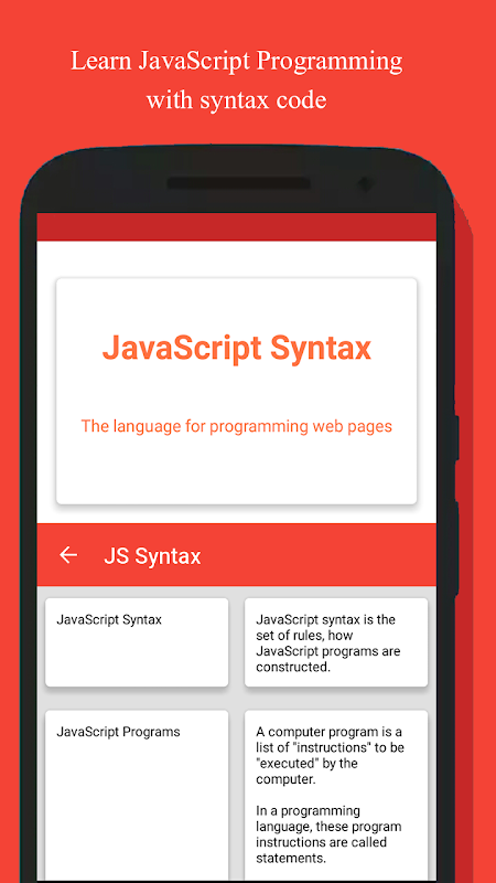 This Application will teach you about JavaScript in detail with it's Programming Concept and you can easily see the Programming Output at a time with it's code.