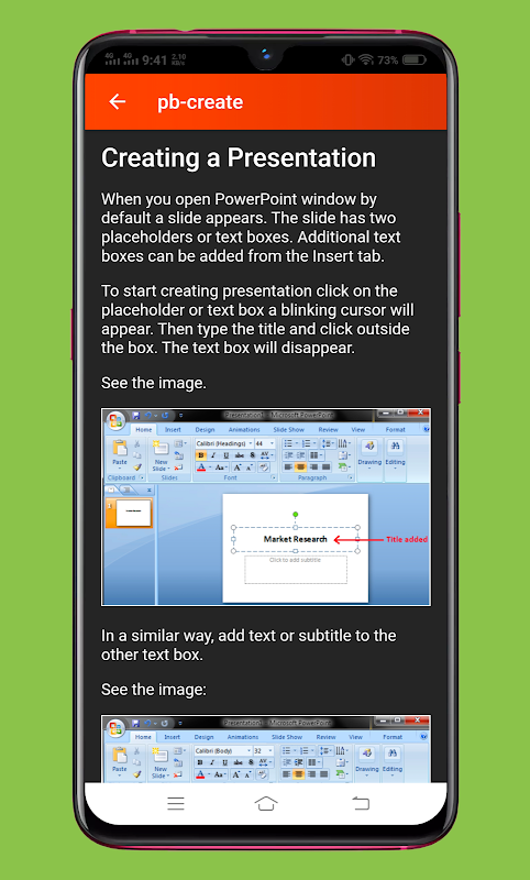 Learn MS PowerPoint, MS PowerPoint Tutorials.This app covers basic to advance concepts of MS PowerPoint. Learn MS PowerPoint app will help you increase your knowledge about MS PowerPoint. Using this app you will be able to learn how to use MS PowerPoint application in computer. This app includes information about how to use different tabs in MS PowerPoint. This app will definitely help you to increase your knowledge of MS PowerPoint.