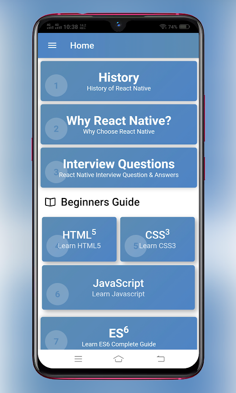 Learn React Native, React Native Tutorials, React Native Programming, Learn React native tutorials, Learn React, Learn react.js, React Native Tutorials for Free and Offline. React Native is a JavaScript framework for building native mobile apps. It uses the React framework and offers large amount of builtin components and APIs. In this application, we are mainly focused on newbies of React Native. So, we are providing best and simple code and examples. Also, every example is designed for easy to understand, so anyone can easy to learn to react native.