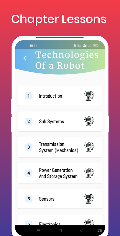 이 Learn Robotics Engineering 앱에서는 로봇 공학, 로봇 기술, 산업용 로봇 및 서보 모터 설계에 대한 모든 간략한 지식을 볼 수 있습니다. Learn Robotics Engineering 앱에는 다음 로봇 기술에 대한 별도의 장이 있으며 자세히 설명되어 있습니다.