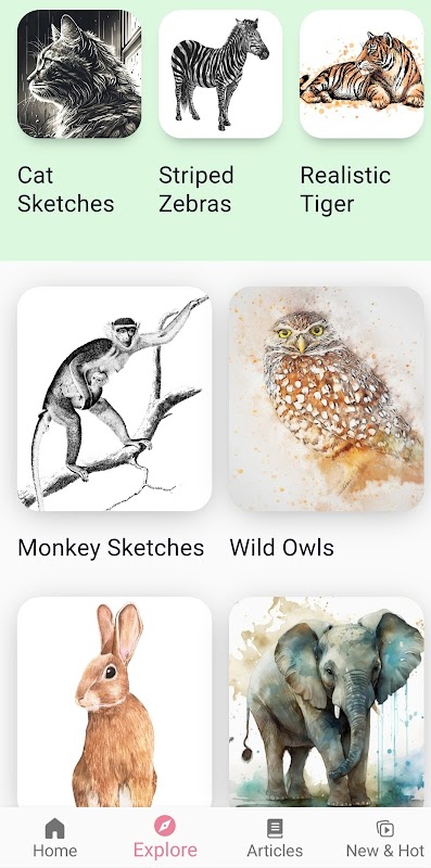 이 앱에는 여러 종류의 동물을 그리는 방법을 알려주는 몇 가지 옵션도 있습니다. 인앱 동영상 튜토리얼을 통해 나만의 동물, 동물원 동물, 야생 동물, 수중 동물을 그릴 수 있습니다. 동물 그리는 법 배우기 앱은 여러 동물의 연필 스케치와 함께 실제 동물을 단계별로 그리는 방법을 알려줍니다.