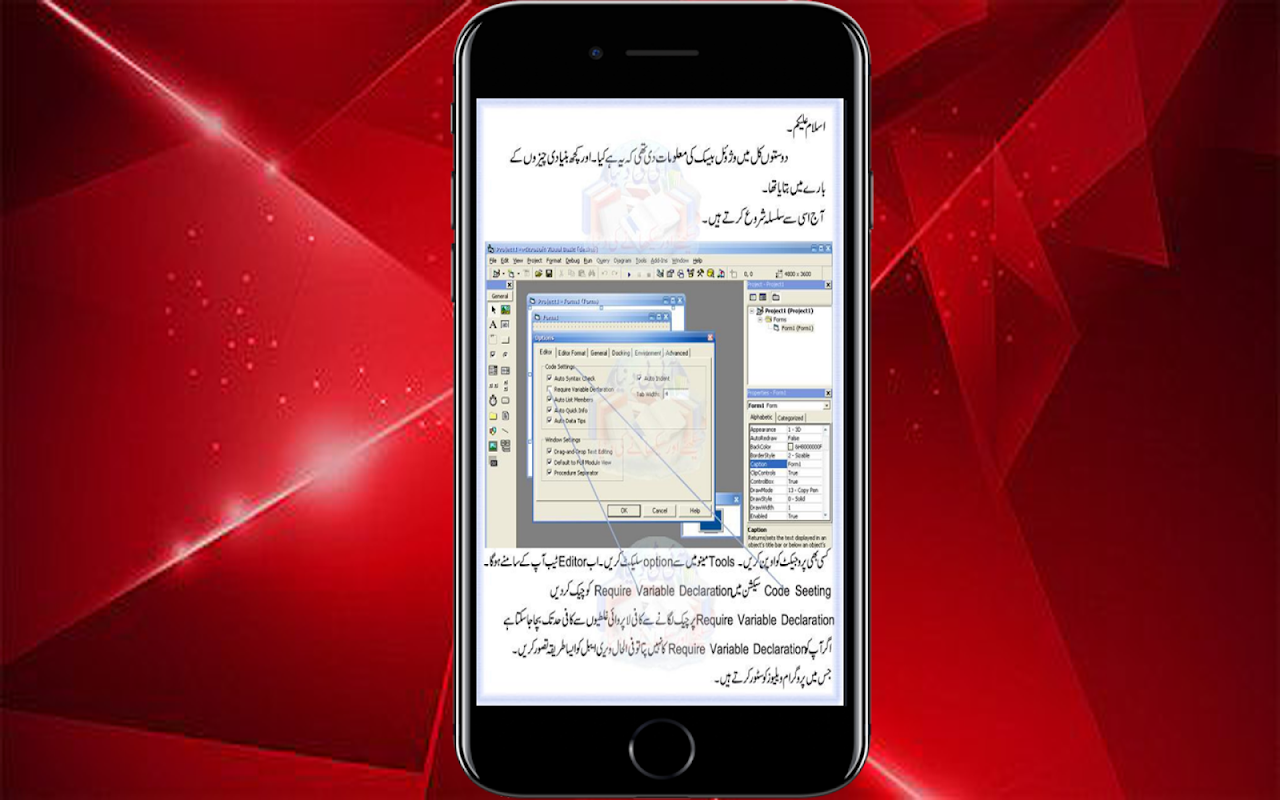 read guide teaching and training course in basic line easy Visual Studio 6 in Urdu. Contact in this book is training classes, how to start, the introduction of program development, which is, Active X, model, professional learning and basic Edition.Visual company, Microsoft Office, toolbar, toolbox , project list, list of objects, form designer class, learning about the tools menu design, the shape of the RGB colors in this software, classes coding, component selection, command buttons, context box MSG Adding support for applications Visual Studio, MSDN, toolbox, instruction Enter and title.