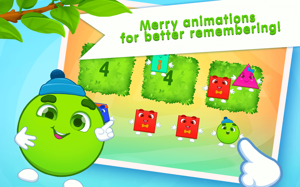 3 세 유아용 학습 게임의 두 번째 게임은 모양과 숫자를 계속 배우는 아이들을위한 진정한 기하학입니다. 화면 중앙에 녹색 사각형이 있으며 일정한 숫자가 있습니다. 사각형 너머에는 몇 가지 애니메이션 모양이 있습니다. 아기는 숫자가 나타내는대로 녹색 사각형에 많은 모양을 드래그해야합니다. 숫자를 계산하는 방법을 배우는 데 크게 기여합니다.