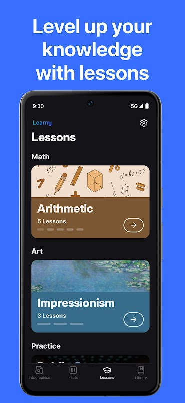 모든 연령대의 학습자를 위해 설계된 Learny는 마이크로러닝을 최대한 활용하고자 하는 성인을 위한 최고의 학습 앱 중 하나입니다. 직관적인 인터페이스와 완벽한 e러닝 경험을 통해 빠른 수업과 포괄적인 정보를 모두 누리세요. 역사, 수학, 철학 등 어떤 학습 목표를 가지고 있든, 저희 학습 앱은 여러분의 참여를 유도하고 유익한 정보를 제공합니다.