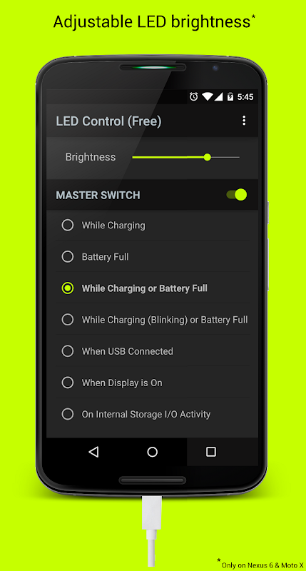 · 밝기 슬라이더 : 장치가 지원하는 경우, 충전하는 동안 당신의 '충전'의 LED 밝기를 제어 할 수 있습니다. 현재는 모토 X와 넥서스 6에서 작동합니다.