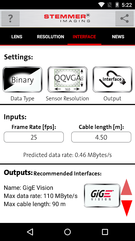 인터페이스 계산기는 귀하의 응용 프로그램의 프레임 레이트, 해상도 및 컬러 포맷에 의해 지정된 데이터 레이트 및 케이블 길이 수요를 충족 호환 카메라 인터페이스를 식별한다.