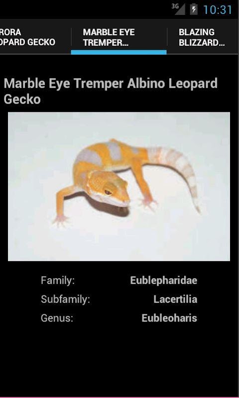 Love Leopard Geckos? Us Too! There are so many great Leopard Gecko morphs out there, and we took several of our favorites and put them all into one great app! Tell your friends and share this app with all your reptile lovin' friends, and we will do our part creating more great exotic animal apps! This includes morphs such as Bell albino's, Mack Snows, Albinos, Patternless, R.A.P.T.O.R's, A.P.T.O.R.S, Tremper Albinos, Hypos, And more!
